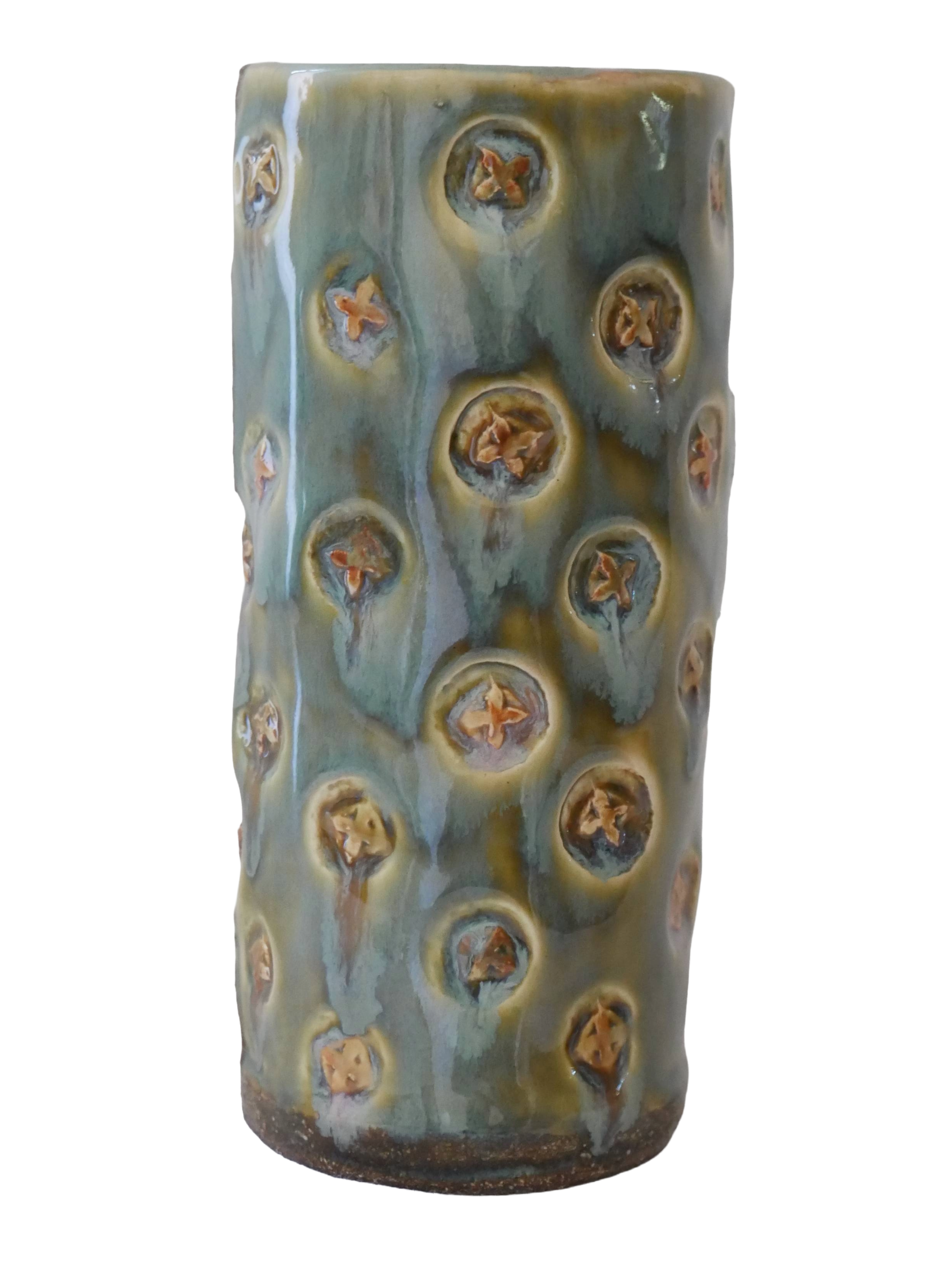 + dusty rose & dark green underglaze with layered combo of cherry blossom celadon, honey flux, birch & seaweed glazes